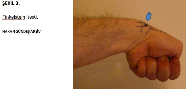 Finkelstein testi genellikle tanının konmasını sağlar (şekil 3). Her hastada el bilek eklemi radyografisi istenmesi tartışmalı olmakla birlikte ek patolojilerin atlanmamasını sağlar. Sıklıkla gözlenen ek patolojiler;
