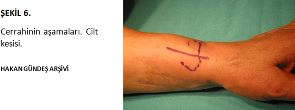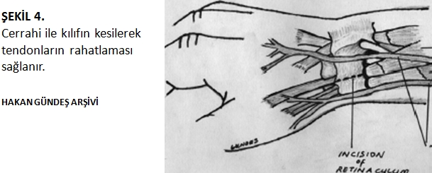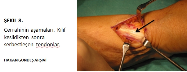 Bu enjeksiyon gebelikte ve emzirirken de güvenle yapılabilir. Başarı oranı %80 dolaylarındadır. Atel tedavisinin başarı oranı %15 civarındadır. Yani her 5 hastadan yaklaşık dördü kortizon enjeksiyonu ile başarı ile tedavi edilebilmektedir. Başarısız olunan hastalarda cerrahi tedavi tek seçenektir. Cerrahi esnasında çevre sinir dokuları dikkatlice korunarak kirişleri koruyan kalınlaşmış kılıf ve içindeki cepler (septa) kesilir ve tendonların rahatlaması sağlanır (şekil 4,5,6,7,8).