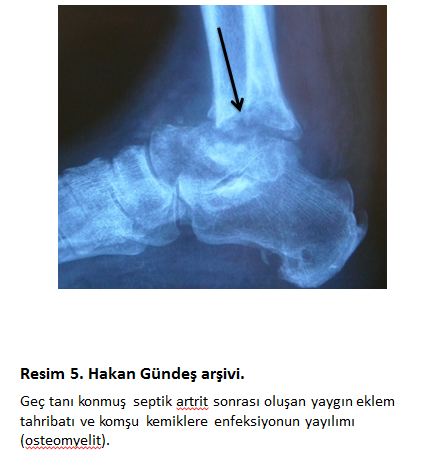 Bu durumda tedavi şeması değişebilir. Hastanın geç başvurusu veya tanının atlanması durumunda,10-12 günlerde çekilen geç direkt grafilerde kemikte tahribat ve eklem yüzeyinde erozyon gözlenebilir.